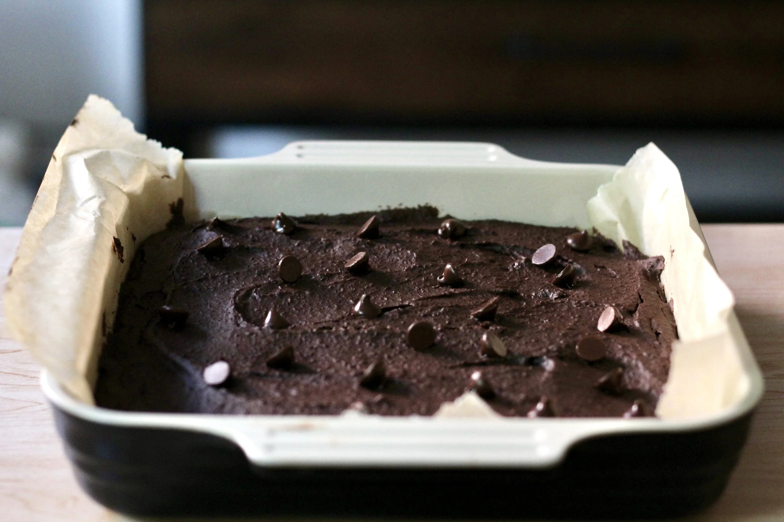 Stir in chocolate chips and pour batter into parchment-lined baking dish. Spread batter evenly and top off with a few more chocolate chips.