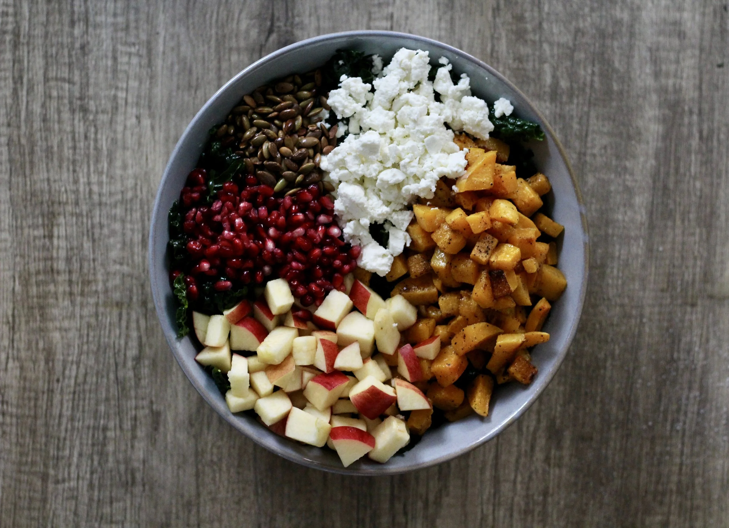 Add the rest of the ingredients: butternut squash, apple, goat cheese, pumpkin seeds, and pomegranate seeds.