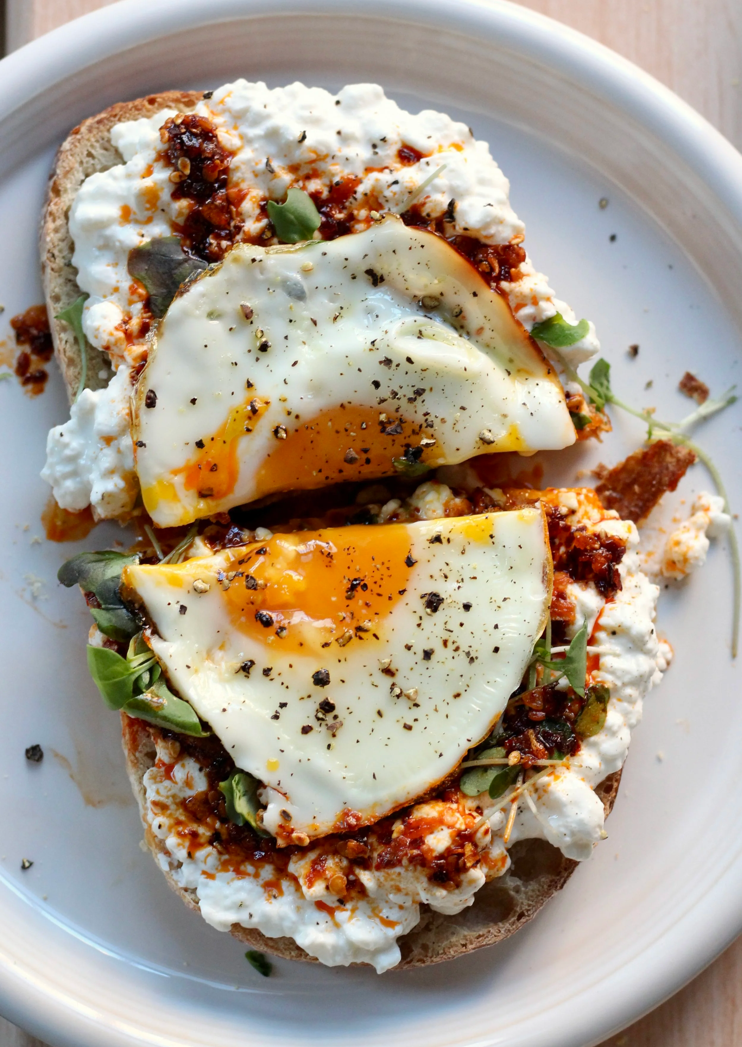 Each toast starts with a generous layer of cottage cheese, which adds creaminess and a solid protein boost, then gets topped with simple ingredients that create big flavor with minimal effort. From a crispy egg with chili crisp, to fresh everything-bagel veggies, to sweet-savory hot honey, to a cozy pizza-inspired version, these toasts cover every mood while coming together in about 5 minutes.