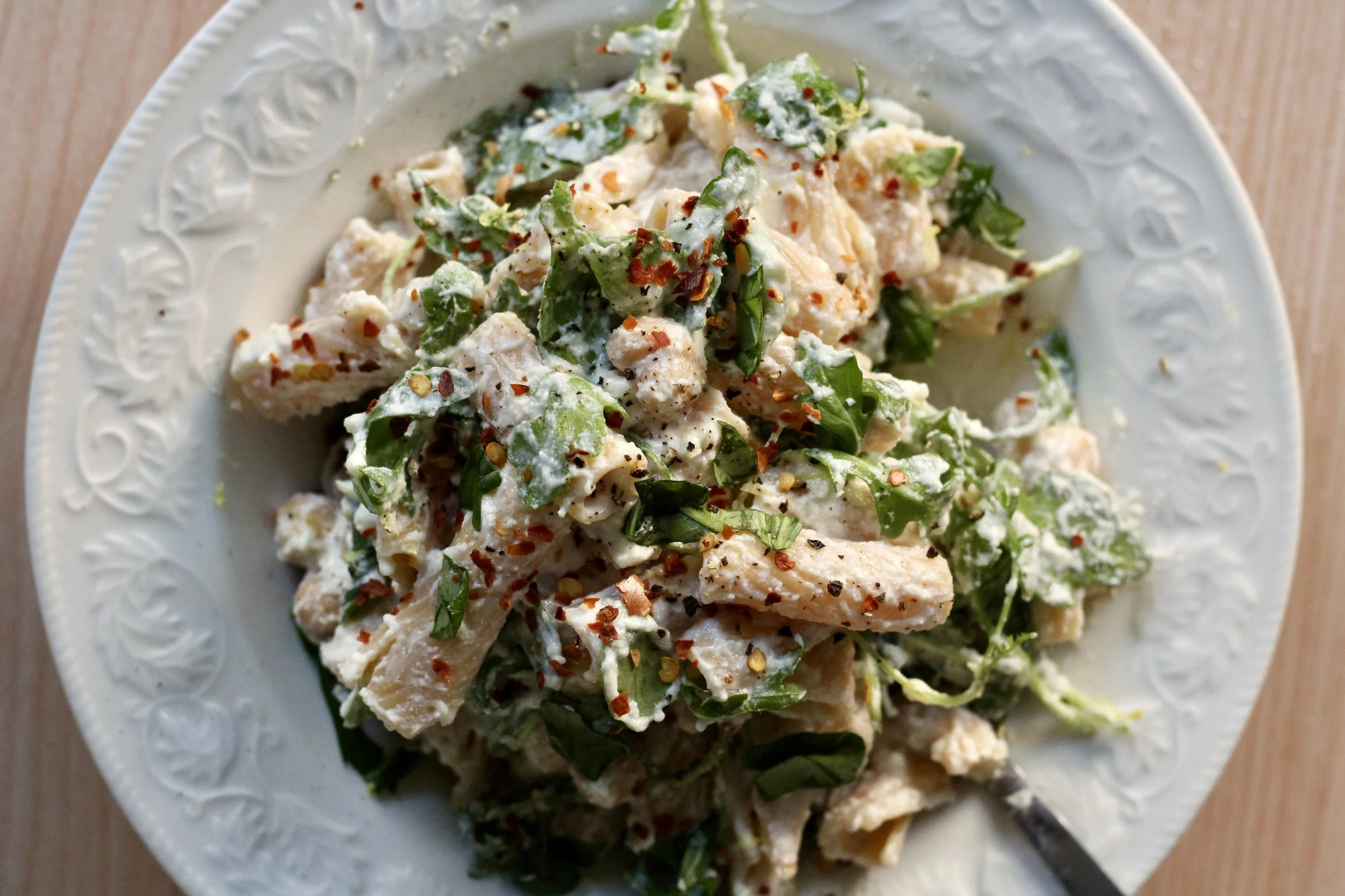 Season with salt, more pepper, and red pepper flakes as desired. Top with fresh basil. Add a squeeze of lemon or sprinkle of Parmesan if desired.