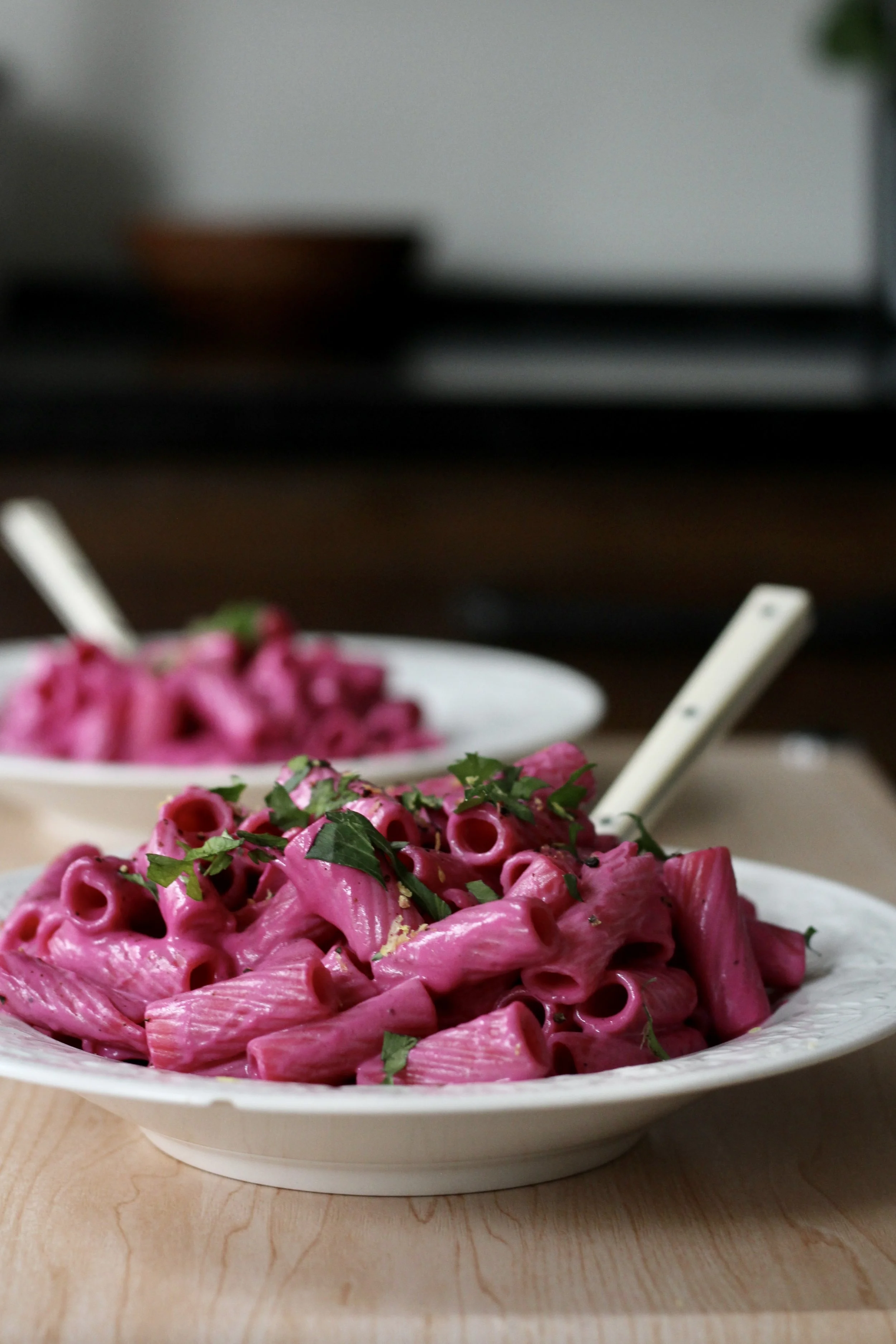 Add all sauce ingredients to a blender (tofu, beet, goat cheese, pasta water, garlic, lemon juice, salt, pepper) and blend until smooth.