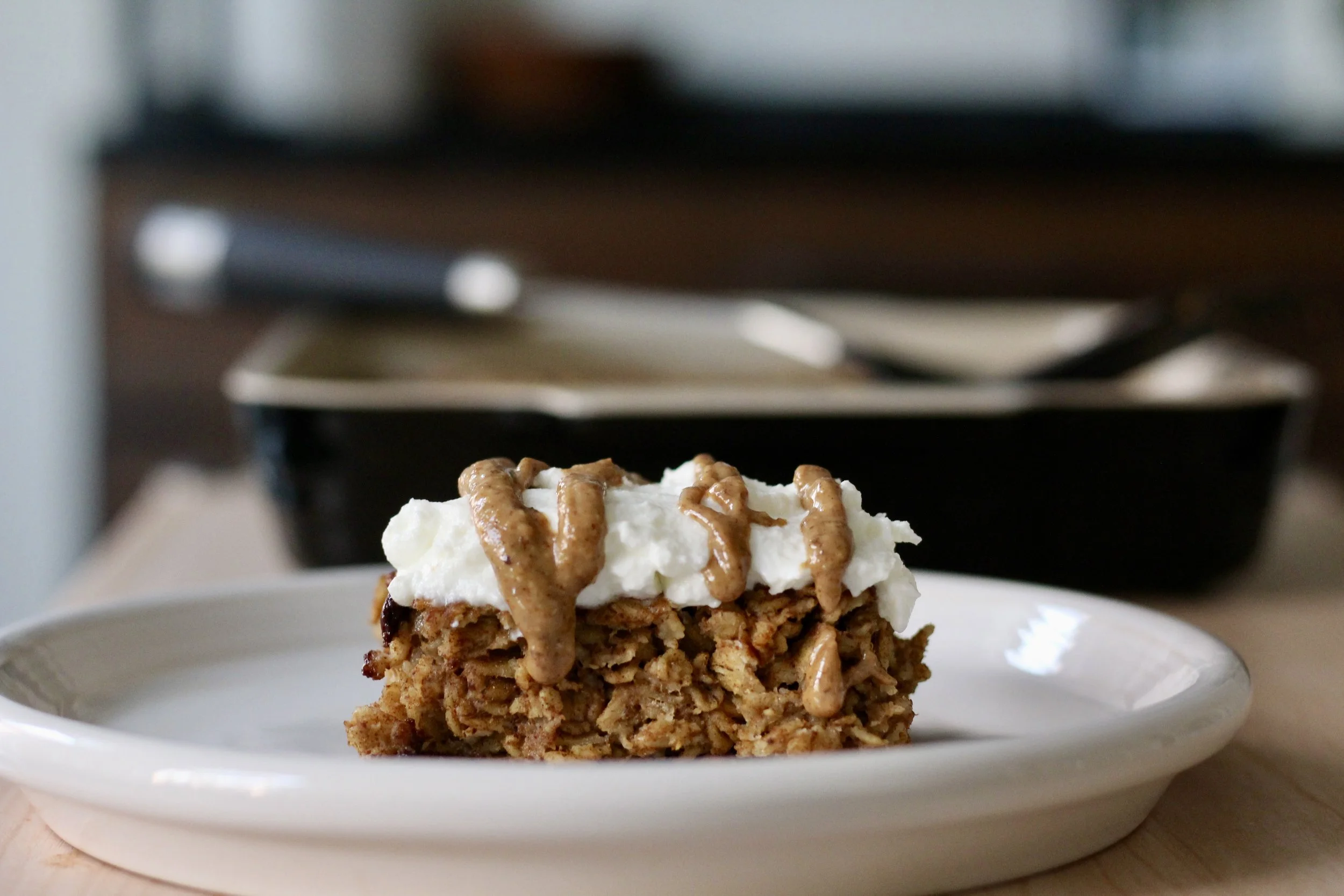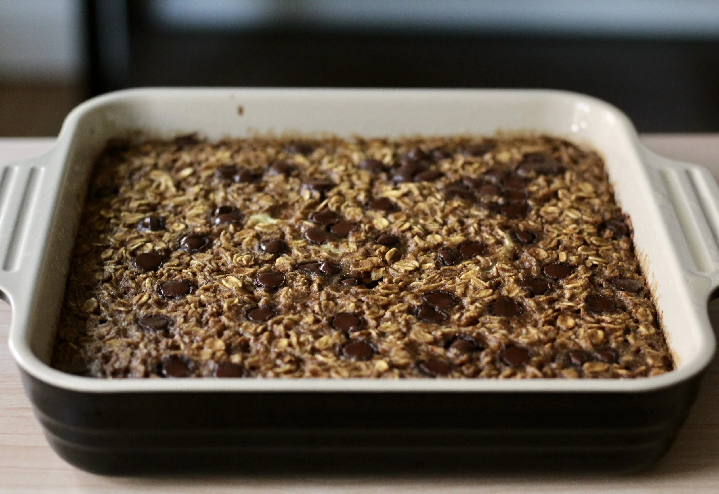 Bake in the oven for approximately 45 minutes or until the baked oats spring back slightly when pressed gently.