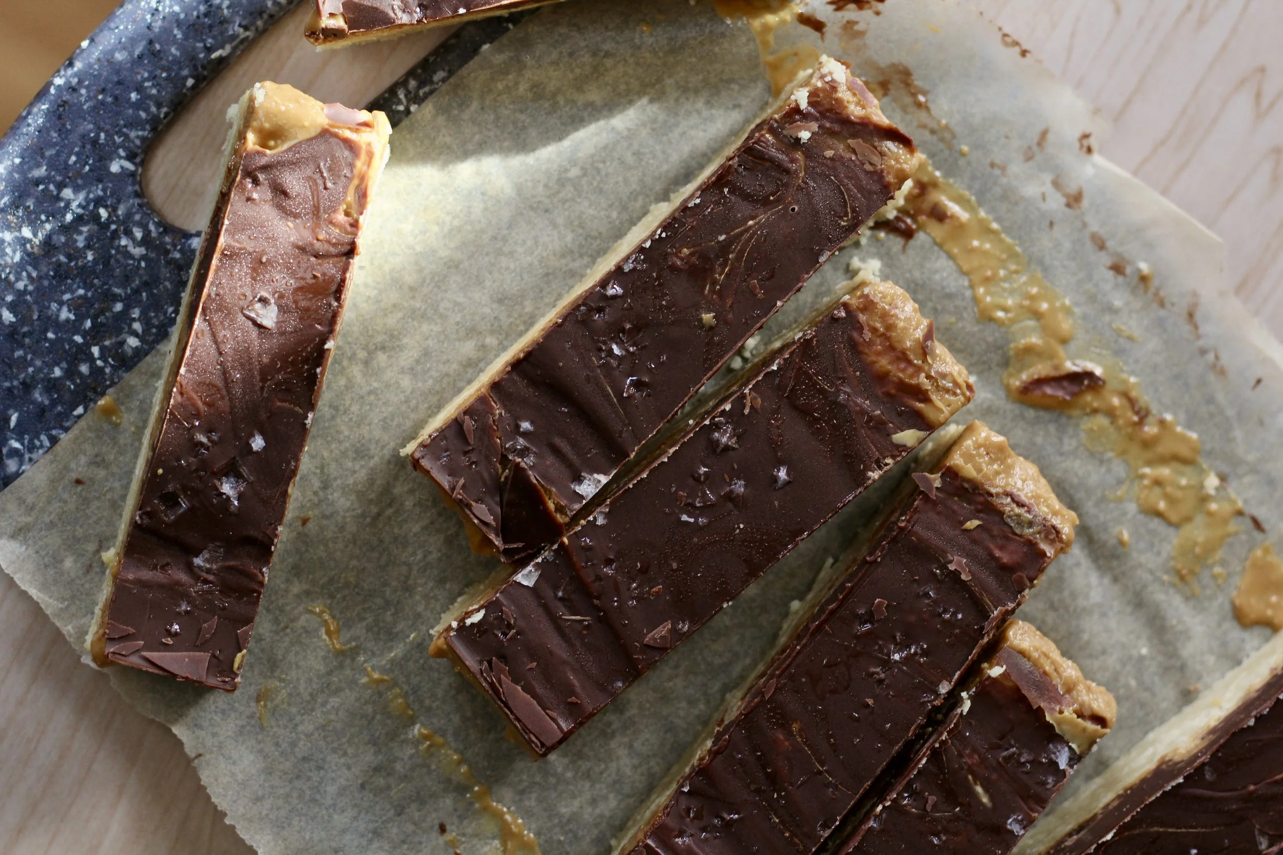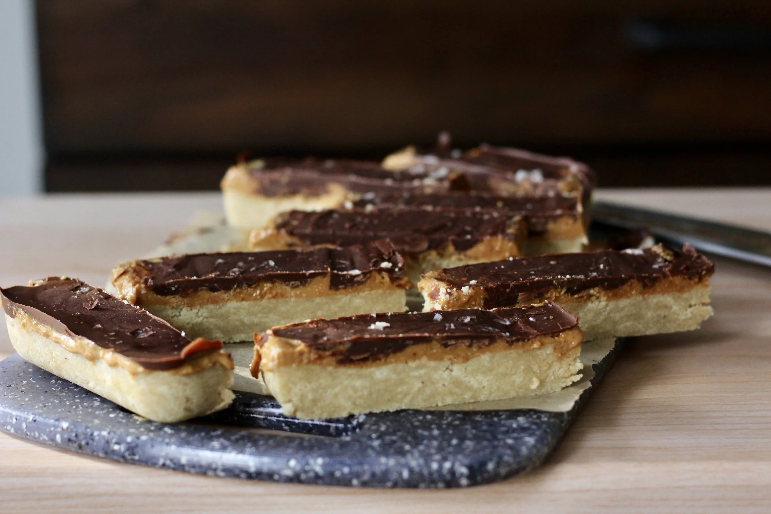 Spread the nut butter on top of the shortbread layer. If you’re adding coconut oil or salt, mix this into the nut butter first before spreading.